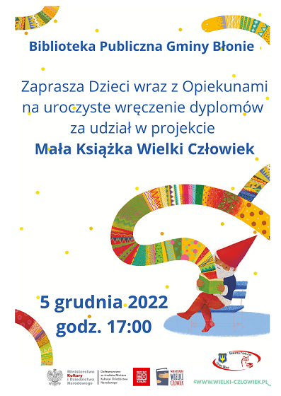 Drodzy Czytelnicy - uczestnicy projektu "Mała Książka, Wielki Człowiek"- uroczyste wręczenie dyplomów najmłodszym Czytelnikom, którzy zebrali komplet znaczków i zgłosili to do Biblioteki, odbędzie się w poniedziałek